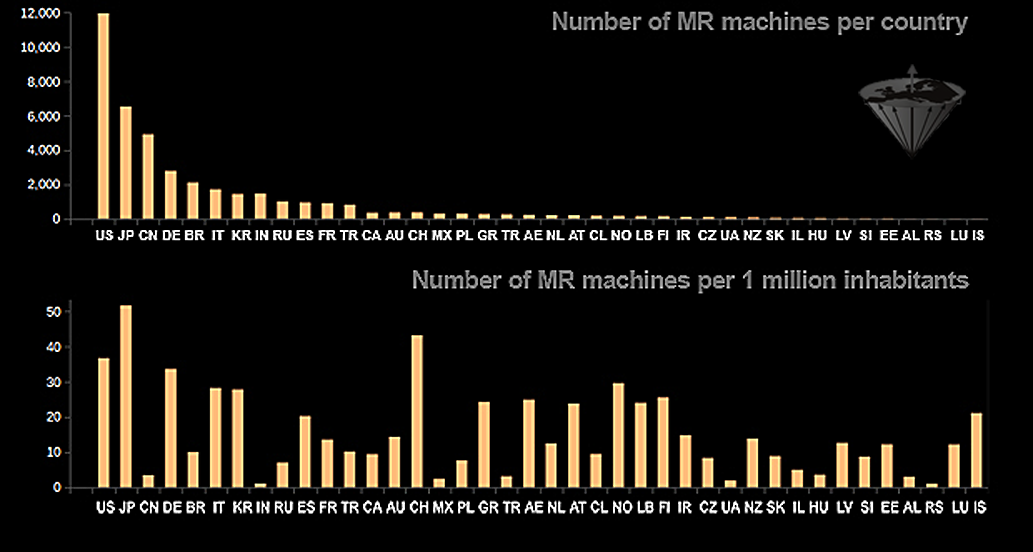 • For the "Facts and Figures" section we try to collect data through our own channels. The numbers published by OECD (Organization of Economic Cooperation and Development) and WHO (World Health Organization) are not absolutely dependable, but the best collected data available from international organizations. In many instances, OECD data do not contain the number of units in freestanding imaging facilities nor those of state or military owned facilities. In many countries even the responsible state administrations (ministries of health) cannot provide reliable numbers, nor can the manufacturers of MR equipment and those of accessories. For some countries, the number given here may substantially differ from those distributed by OECD and WHO. They were collected from insurance or reimbursement companies or private sources.